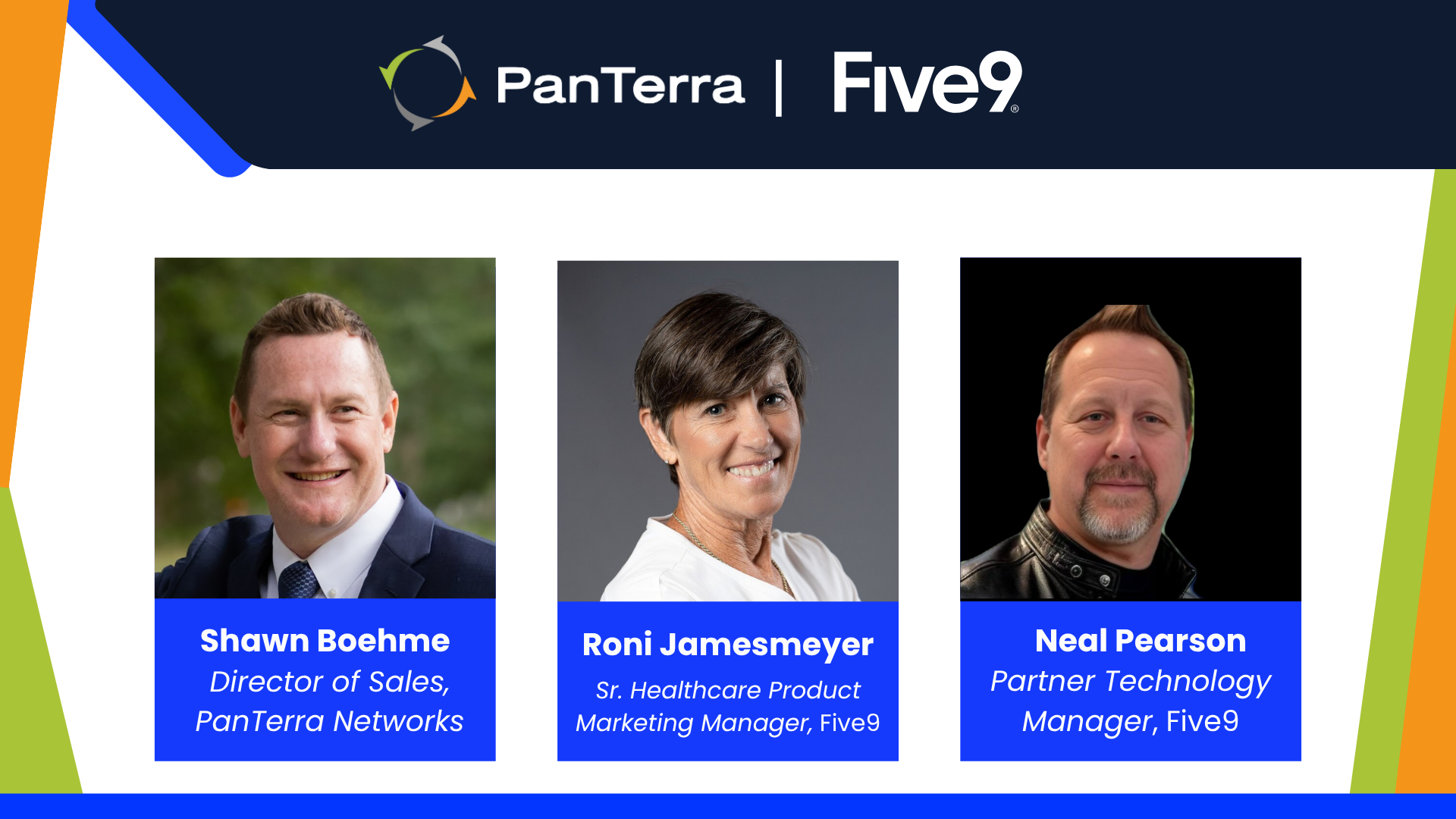 PanTerra and Five9 Healthcare webinar speakers: Shawn Boehme, Roni Jamesmeyer, Neal Pearson
