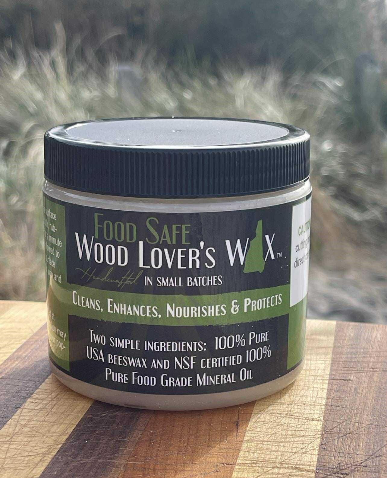 Wood Lover’s Wax Food Safe Wax jar displayed on a striped wooden board with natural background.